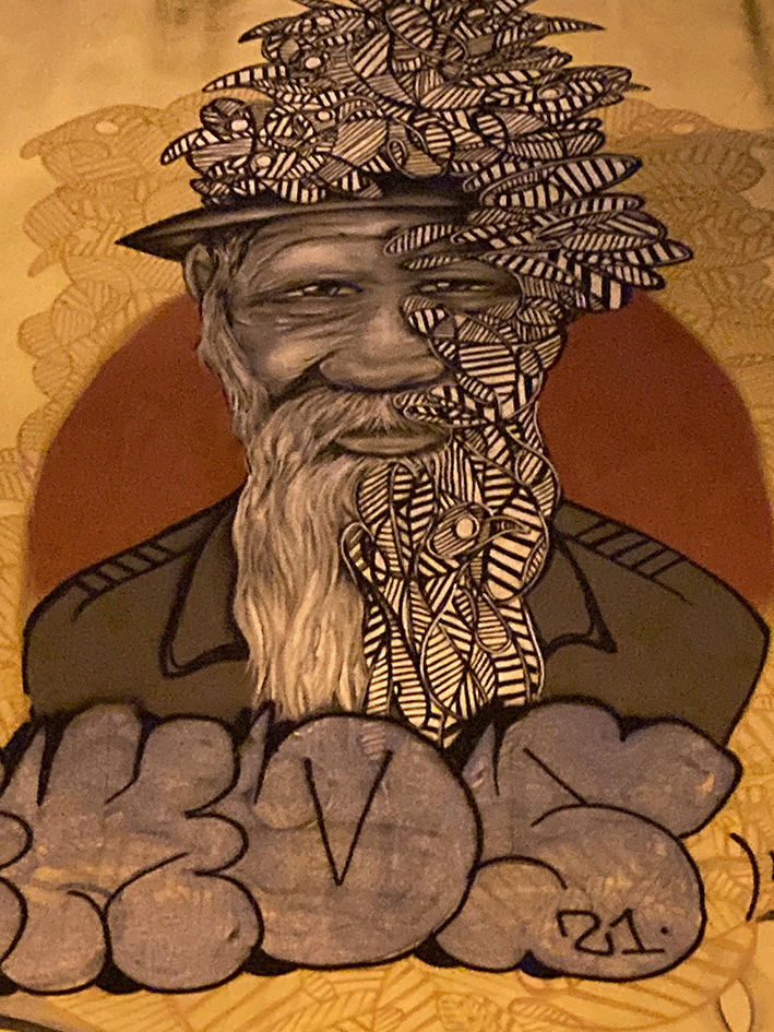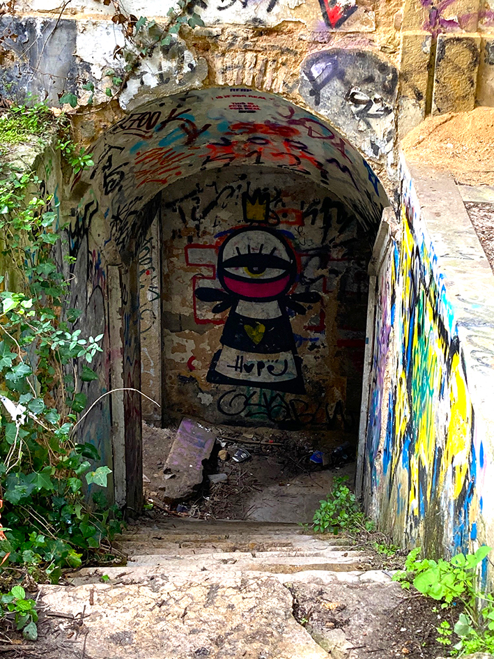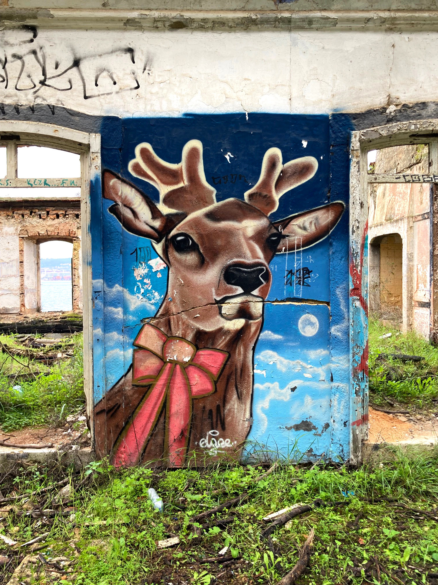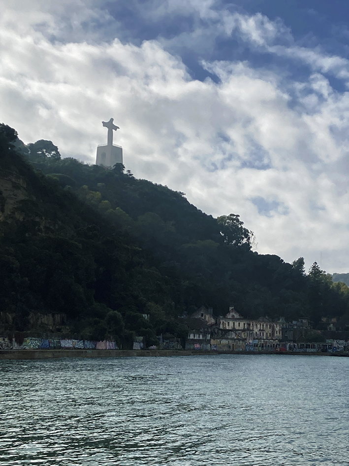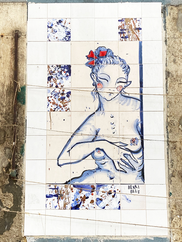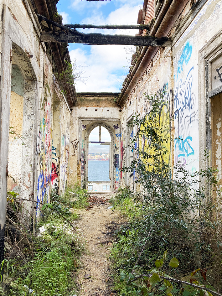Le lendemain, on rejoint Léo. On prend la navette fluviale, direction Cacilhas, de l’autre côté du Tage, pour rejoindre le mouillage du Bateau. Avant, on a fait une longue balade jusqu’au pont de Lisbonne, en longeant les anciens docks abandonnés. Les graffitis sont partout sur les murs lézardés. La balade mène, entre-autre, à deux petits restos qui vous tendent les bras de ses chaises pour chiller au bord du Tage, et, aussi, à l’ascenseur panoramique de la Boca do Vento, qui vous emporte tout en haut à la ville d’Almada. Nous, on a poursuivi notre chemin jusqu’à la Quinta de Arealva, ancienne propriété viticole abandonnée, comprenant à l’époque, un petit palais, des entrepôts, une tonnellerie… Pour y arriver deux solutions, passer le grand portail vert et suivre le chemin qui sent l’eucalyptus et qui mène au domaine ou emprunter le sentier côtier. Heureux les explorateurs urbains. Le site est énorme et ici encore, l’art a envahi les murs. C’est sublime.