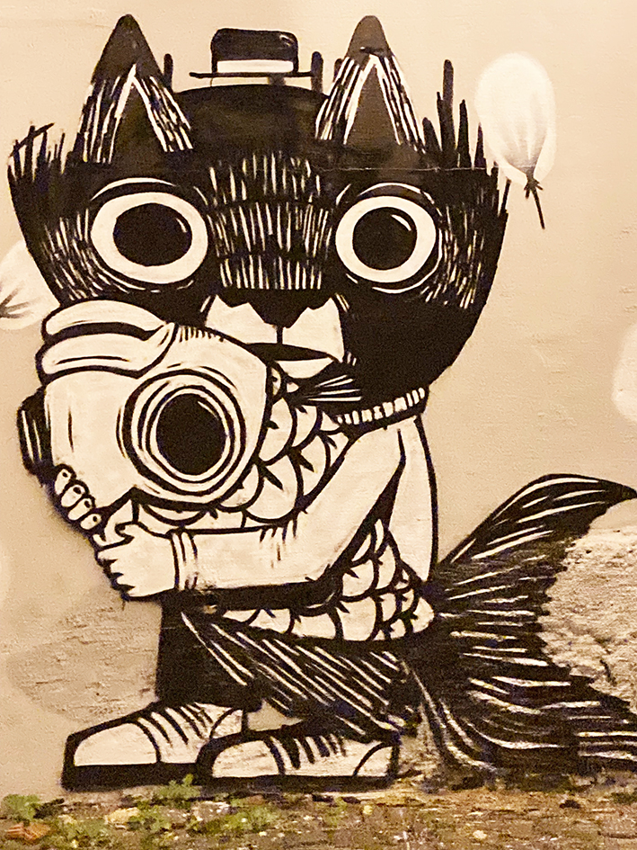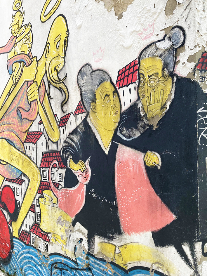 Le jour de notre arrivée – plus tard que prévu, la faute à un avion qui ne voulait pas décoller – on a rejoint Léo vers Caïs Do Sobré, le quartier de la gare et des docks. Autrefois malfamé, il a été complètement transformé et, est devenu the place to be pour faire la fête. On a fait un tour rapide au Time-Out Lisboa, un food market installé dans une aile du marché de Ribeira – miam miam. Juste le temps d’acheter des croquetas et de continuer notre route. Le marché tradi était fermé. Il n’ouvre que jusqu’à 14h et le dimanche, en lieu et place des fruits et légumes, et autres denrées périssables, il n’y a que des stands de timbres à se mettre sur la langue ! Ben du coup, on l’a pas vu ! On s’est promenées dans le Bario Alto. On a gravi et descendu la montagne. On s’est émerveillées de l’art urbain qui s’exposait sur les façades des maisons, faisant éclater de couleurs ce quartier pittoresque. On a cherché un bar sympa pour se poser et, finalement, on s’est installés sur la terrasse du rad d’un vieux pépé, tout en haut de la rua de Diario de noticias, vers le n° 147. Là, on a goûté de la Ginja, une liqueur à base de griottes. C’est sucré ! Après l’apéro, direction le restau. Ce soir, ce sera A Provinciana, quartier Baixa, pas très loin de la place Rossio. Trois quarts d’heure de queue. Des coucous de toutes sortes ornent les murs du resto, figé dans son jus. L’unique serveuse, peut-être la patronne, court partout avec le sourire. On a repéré en plat du jour du porco à l’Alentejana, du porc cuisiné avec des coques. On salive ! À l’arrivée, y’en avait plus. Ben, on prendra autre chose. Seiche, sardines grillées, saucisses, escalope de porc, le tout accompagné de riz, patates bouillies ou frites maison,… Cinq plats copieux pour quatre et du jambon de pays. Comment dire, c’est bon, pas à se taper le cul par terre, loin de là, et c’est rustique. De toute façon, depuis notre voyage à Porto, vous savez ce qu’on pense de la cuisine lusitanienne… Voilà, voilà ! C’est déjà l’heure d’aller au lit !