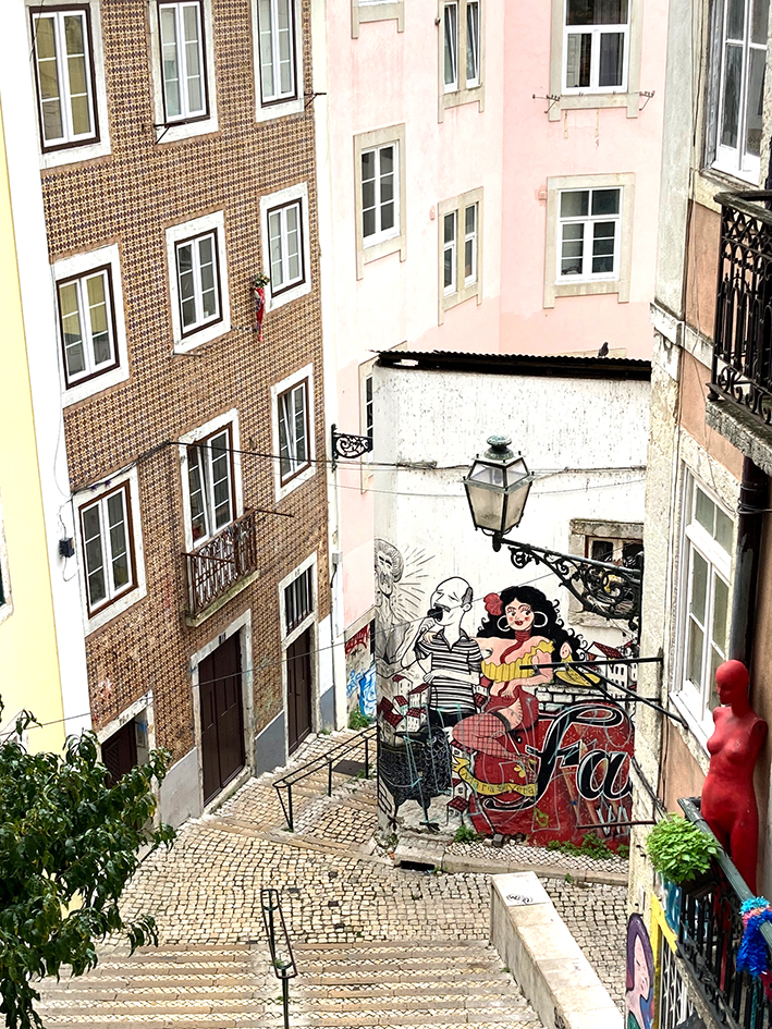 Vous ne l’avez peut-être pas remarqué, mais dimanche, on n’était pas là. Une fois de plus on a disparu. On est parties. On a pris le RER, l’avion, tout ça, tout ça… Direction Lisbonne. Notre bilan carbone est cramé ! Et oui, ça fait un peu deux fois, qu’on va au Portugal cette année. Nos jambes et nos pieds ne nous disent pas merci ! La ville n’est que pentes et escaliers vertigineux. Pire qu’à Porto. C’est plus de la balade, c’est de l’escalade. On en pouvait plus. Dans nos souvenirs – on avait, déjà, visité Lisbonne, deux fois – c’était pentu, mais pas à ce point ! C’est l’âge ma pauvre Lucette… En plus, les petits pavés qui recouvrent, si joliment, les trottoirs, se transforment en patinoire avec la pluie. Oui, il a un peu plu. À peine. Mais, comment font les vieux lisboètes pour survivre à tant d’adversités ? Nous, tous les soirs, on était cannées, dead, occises !
