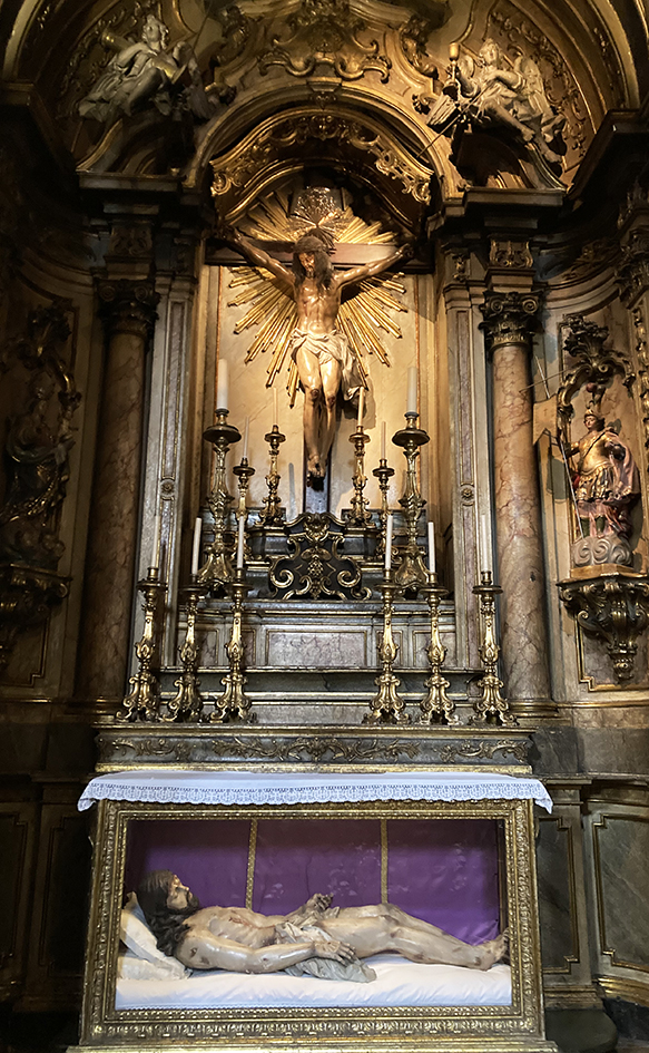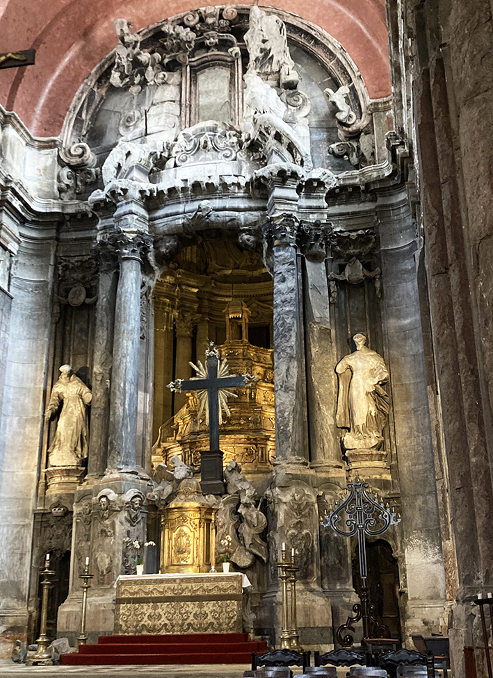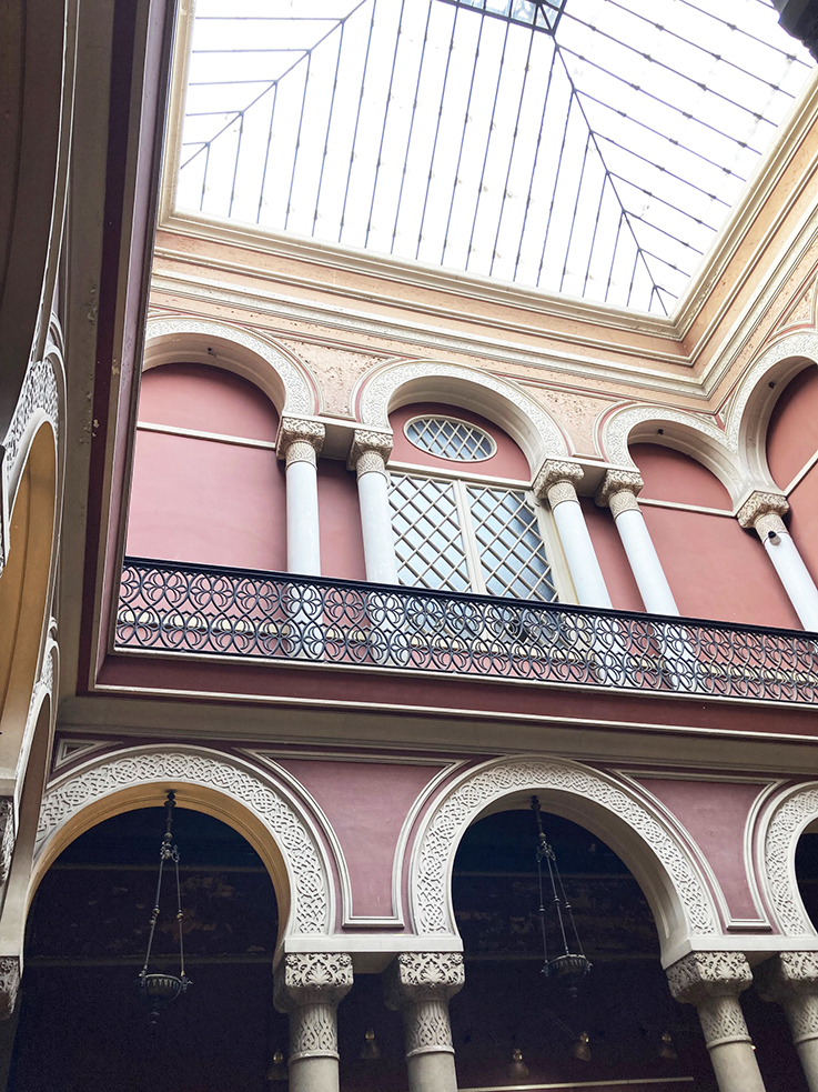 Dernier jour à Lisbonne avec nos cocos. Avant de les retrouver, nous, on fait un petit tour vers Rossio. On visite l’église de Sao Domingos, le cœur de Lisbonne depuis le XIIIe siècle. La pauvrette, si imposante à l’extérieur, semble avoir eu la lèpre à l’intérieur. C’est qu’elle en a eu du malheur. Elle a souffert d’un tremblement de terre et d’un incendie. Les voies du seigneur sont impénétrables ! Bon, on en a fait d’autres des églises mais elles ne valaient pas trop le détour, comparées à celle magnifiques de Porto. Puis, on est retournés, avec Ema et léo, dans le quartier de l’Alfama pour une balade plus longue. On s’arrête dans un petit resto qui ne paye pas de mine. Les menus s’affichent à 6 ou 10 euros. Soupe, bifana – un sandwich au filet de porc, pané ou pas, typique du Portugal – pour Léo et Ema. Pour nous, ce sera soupe, filets de porc et ou de poulet, noyés dans une sauce au beurre, frites et riz. Café pour tout le monde. On ne sait pas pour les sandwiches, mais notre noyade au beurre était bien « goûtue ». Le meilleur truc qu’on est mangé ici, et à Porto ! De retour vers notre appart-hotel, on s’arrête à L’Ambaixada, un palais au style oriental, du XIXe siècle, transformé en concept store. Le lieu est assez beau, mais on ne s’attarde pas à faire du shopping. Il est temps de reprendre nos bagages et de partir.