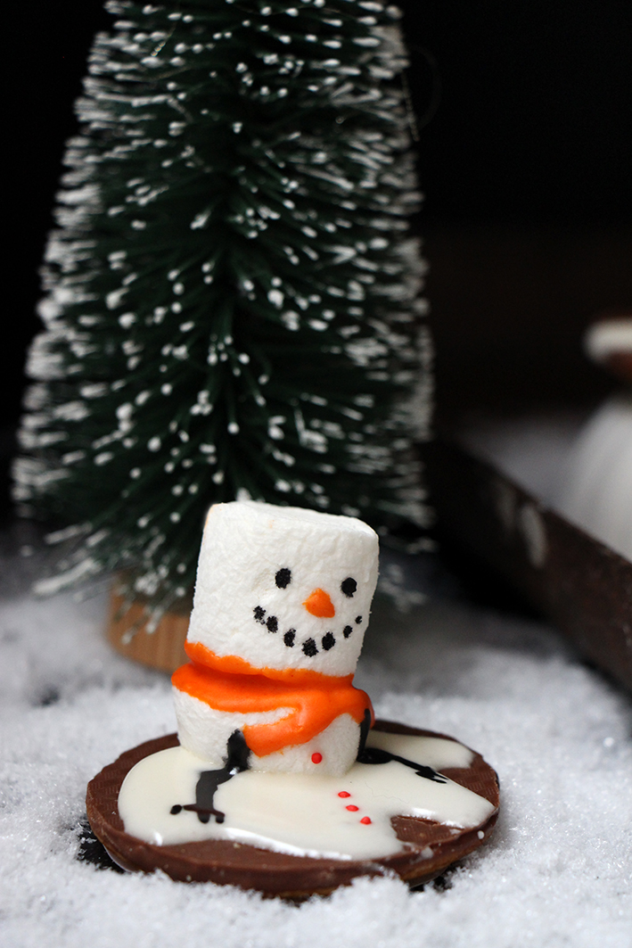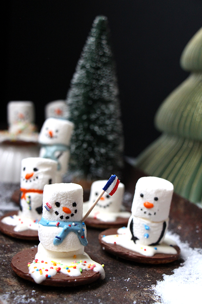 On est en retard, en retard, en retard… On pensait faire ces trop adorables petits bonhommes de neige, en deux temps trois mouvements, mais c’est que ça prend du temps à faire ces petites choses. Monter les petites créatures et leur donner vie… Geppetto, sort de nos corps ! On s’applique. Trouver la bonne texture pour le glaçage, le colorer, et l’appliquer avec amour ? Leur faire des sourires même si en vrai, nos bonshommes sont censés être en fâcheuse posture. Ils fondent. Bref, on est en retard, parce qu’il y a foot aujourd’hui. À quatre heures pile, il n’y aura plus personne devant l’ordi, ou presque… Les écrans vont se substituer à d’autres écrans. D’ailleurs, on avait prévu de regarder le match, toutes seules, comme deux pauvresses, et finalement des voisins et un ami se joignent à nous. Du coup, c’était branle-bas de combat. On a dû changer la télé de place, pour l’installer dans le salon. Entre nos pots de glaçages colorés, les vermicelles colorés et les marshmallows et tout le reste, le salon ressemble à un champ de bataille. Enfin bref, on s’est bien amusées. On a même fait un petit bonhomme aux couleurs de la France hhihihi ! Alors faites comme nous, pâtissez, amusez-vous, dévorez.