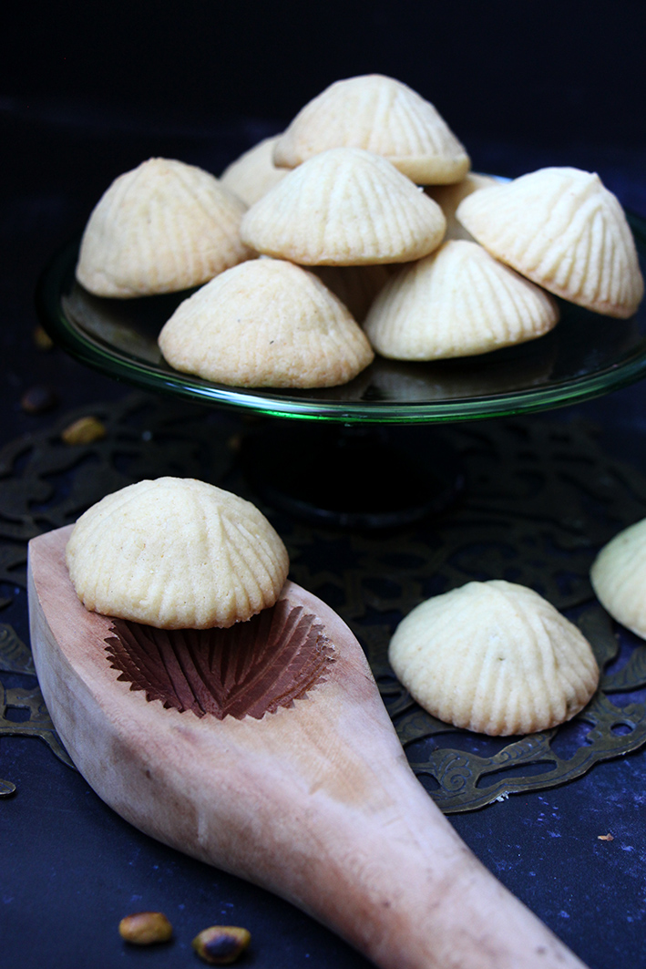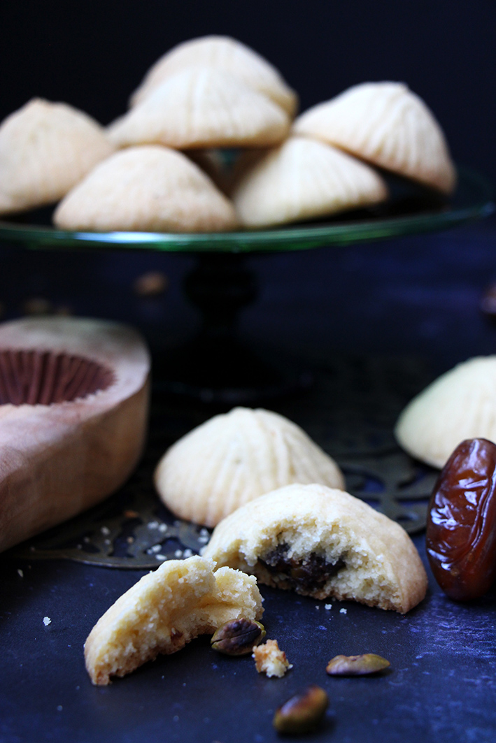 Pour chaque boulette : Aplatissez la pâte dans la paume de votre main pour former un disque. Ajoutez une petite boulette de pâte de datte au centre du cercle de pâte, refermez-la et formez une boule. Nous nous avons utilisez des moules traditionnels en bois dans lesquels on vient écraser la boule obtenue pour qu’elle prenne la forme et imprime le décor. Puis, on tape, un bon coup, le moule pour que le gâteau ressorte tout beau. Bon, parfois le gâteau roule et s’écrase au sol ! C’est le risque ma bonne Lucette…  Bref, vous pouvez vous en passer. Une fois la boule obtenue, aplatissez sa base sur votre plan de travail pour que vos gâteaux ressemble à une demi-sphère. Tracer un décor sur le dessus avec une fourchette.