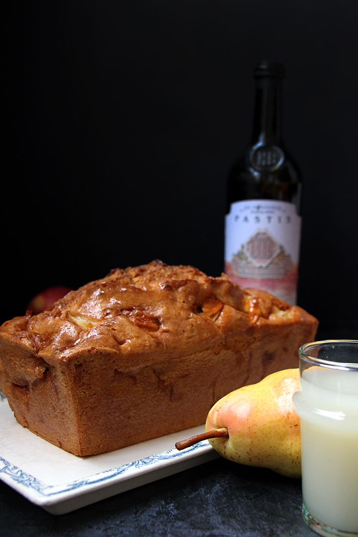 Oh peuchère, malgré nos promesses d’ailleurs, on est restées dans le sud. La mer, le soleil, la pétanque, les cigales et le pastaga ! Et oui, pardi, quand on aime on s’incruste ! Ça doit être la chaleur parisienne qui nous tape sur le ciboulot ! Hihihi, nan, en fait, c’est un passage par l’hypermarché Carrefour à côté de chez notre mère, qui nous a donné l’idée. Au rayon jus frais, on est tombé sur une bouteille de petit jaune (c’est son petit nom), mélange poire, anis, de la marque Andros. Intriguées, on est reparties avec le flacon et, on a adoré le breuvage. Ben voilà, il n’en fallait pas plus pour que naisse l’idée de ce cake. Oui, alors, on a quand même hésité à vous faire la version alcoolisée du cocktail avec du pastis et du jus, mais l’idée fait la recette. C’est pas sorcier ! Donc, tada… Voilà le joli et énorme cake qui sent tellement bon la Méditerranée. Pâtissez, voyagez, dévorez !