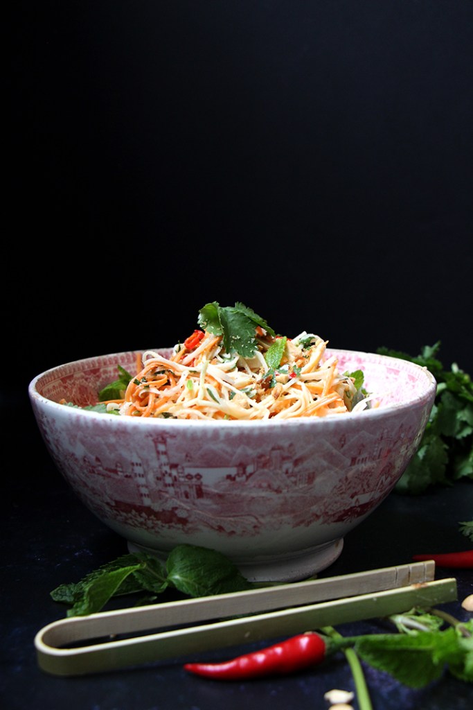 Dans un cul-de-poule, mélangez les carottes et le chou râpés. Ajoutez la préparation à base de mayonnaise. Ajoutez la menthe, la coriandre et le piment émincés finement. Mettez votre coleslaw dans un joli saladier. Parsemez d’oignons frits, de quelques feuilles de menthe, de coriandre et des cacahouètes. Dévorez !