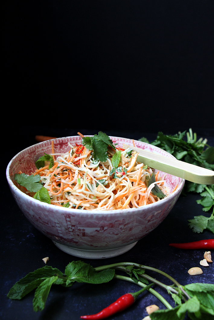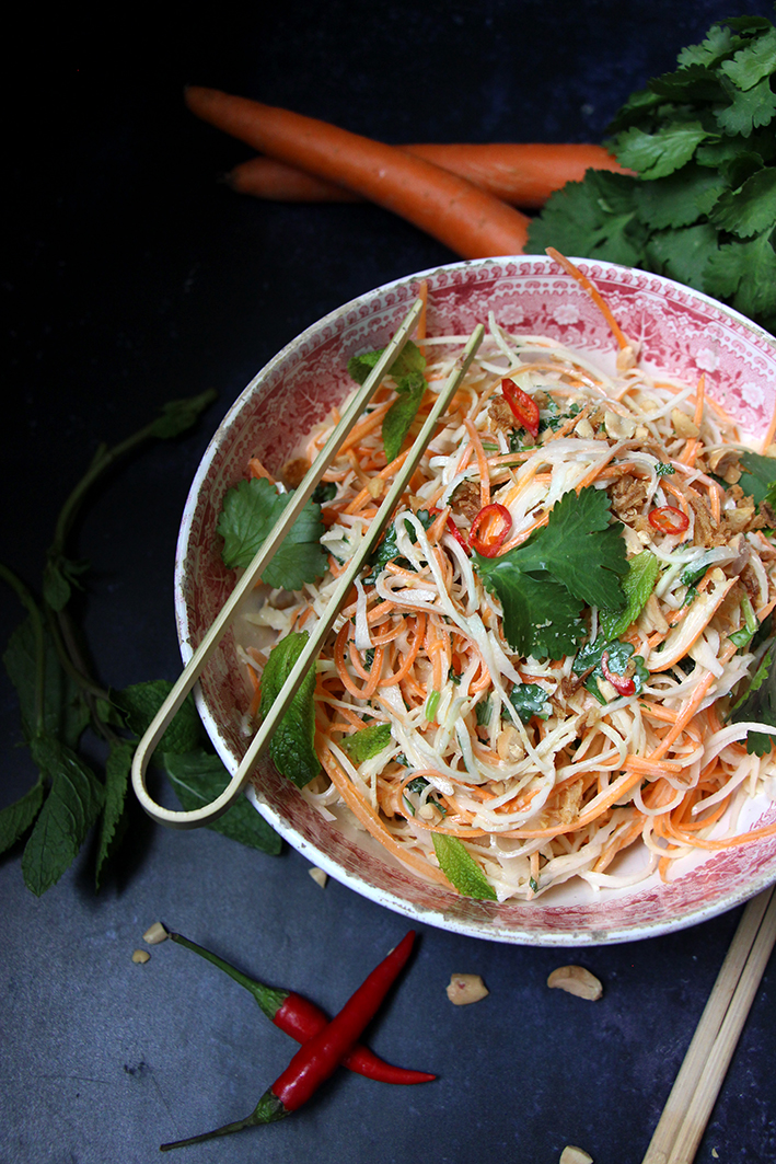 Dans un cul-de-poule, mélangez les carottes et le chou râpés. Ajoutez la préparation à base de mayonnaise. Ajoutez la menthe, la coriandre et le piment émincés finement. Mettez votre coleslaw dans un joli saladier. Parsemez d’oignons frits, de quelques feuilles de menthe, de coriandre et des cacahouètes. Dévorez !
