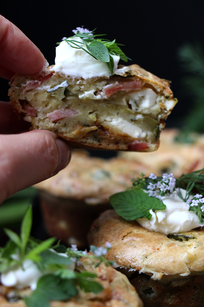 Décorez les muffins d’une petite quenelle de cream cheese et de quelques feuilles aromatiques. Disposez sur un joli plat et dévorez !