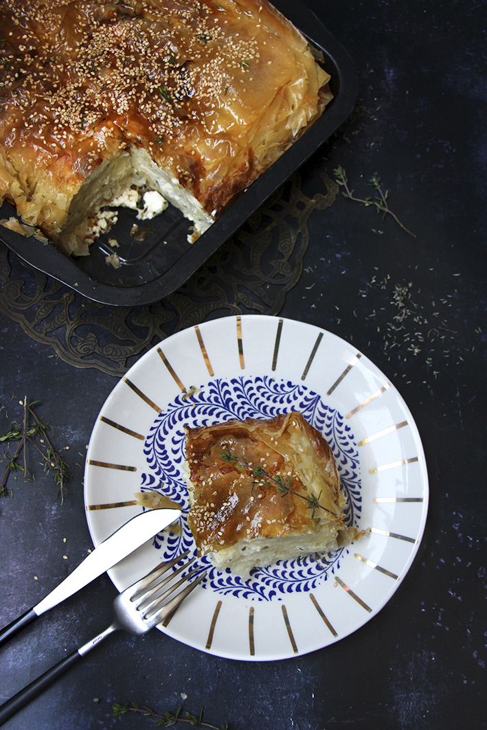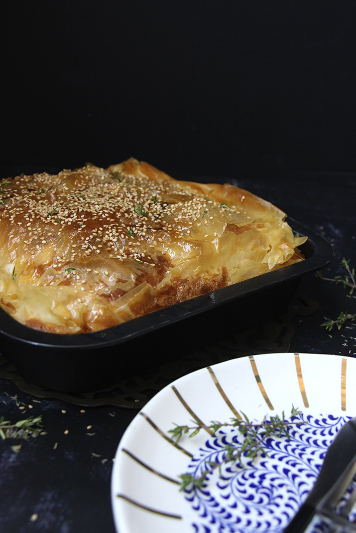 Versez la crème sur la tarte, à l’aide d’une louche. Faites attention de ne pas en faire couler sur le plan de travail. Terminez par une feuille filo sur le dessus et bordez le plat avec les feuilles qui dépassent. Badigeonnez le dessus d’huile d’olive. Enfournez à 180°C, pendant environ 40 minutes. Lorsque le dessus est bien doré, badigeonnez-le de miel délayé dans un peu d’eau ! Parsemez de graines de sésames torréfiées. Dévorez avec une salade !