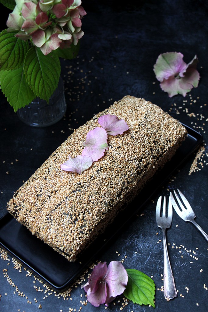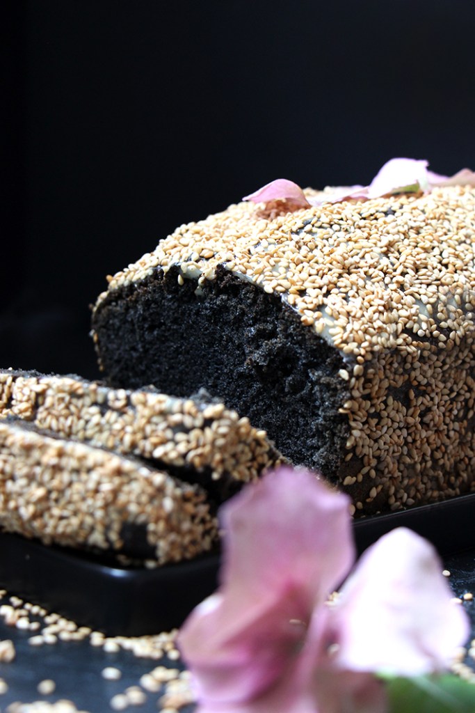 Pendant que le cake refroidit, faites fondre le chocolat blanc en petits carrés avec un peu de crème liquide. Mélangez. Le glaçage doit être lisse et assez épais, pour coller les graines de sésame. Avec un pinceau, badigeonnez le cake de chocolat blanc. Saupoudrez de graines de sésame torréfiées pour le recouvrir. Dévorez !