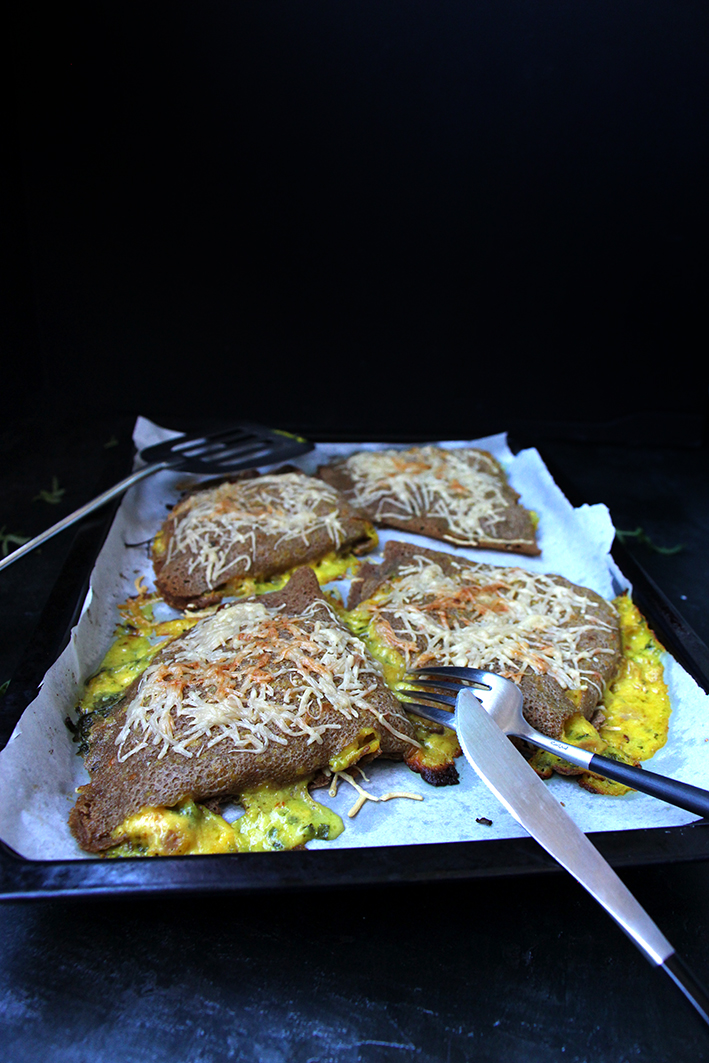 On vous a fait des crêpes ! Ah ouais, ce n’est plus la Chandeleur et en plus, il y en avait déjà sur les photos de la recette précédente. Ben, y’a qu’à dire que c’est une thématique… Oui, et on a zappé la Saint-Valentin. De toute façon, on était parties, et on n’est pas du genre à faire des gâteaux en forme de cœur. On est allées en Auvergne, comme d’habitude. Mais cette fois, surprise, il y avait de la neige. Ouiii ! On a profité de l’occasion pour se promener dans les montagnes, admirer le paysage, entendre la neige craquer sous nos pas et faire une bataille de boules de neige. Bref, le bonheur ! On a fini la semaine en faisant un barbecue, sous 25°C au soleil. Le grand écart des températures. On a découvert, là-bas, cette recette avec notre neveu Léo, qui voulait absolument la tester. La façon de faire la béchamel est très « unorthodoxe », mais le résultat a un goût de « reviens-y ». Délicieux. À la base, on avait prévu deux crêpes par personne, mais une invitée surprise a tout chamboulé. Alors, qui se sacrifie ? Pouf, plouf, ça ne sera pas moi ! Pourtant, la recette du livre dit une crêpe par personne, mais sérieusement, c’est pas assez… sauf si vous avez prévu un autre truc à côté, évidemment. Bref, on vous refait la recette, parce que tout le monde n’a pas encore le dernier bouquin d’Ottolenghi, Confort. On a conservé l’originale, et noté nos modifications. Rendons à César ce qui est à César Ottolenghi. Découvrez, cuisinez, partagez et dévorez !