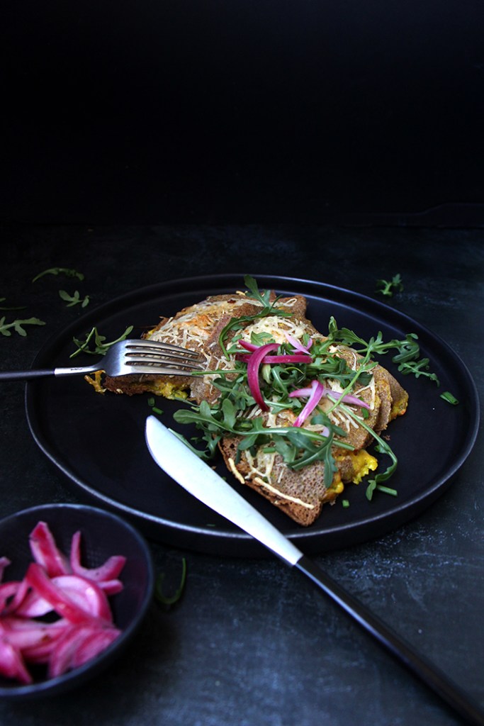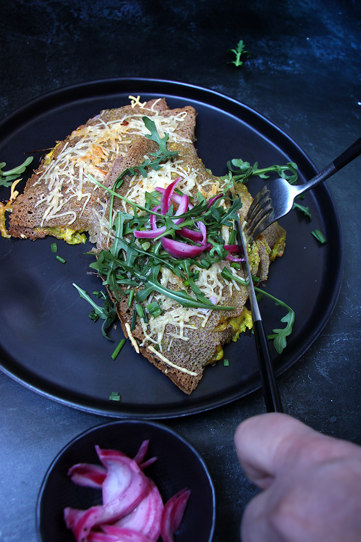 Étalez les crêpes sur le plan de travail. Tartinez la moitié de la surface de chaque crêpe avec 1 cuillerée à soupe de béchamel. Répartissez 40 g de jambon (poulet ou haricots) sur un quart tartiné, ½ cuillerée à soupe de ciboulette ou d’oignons verts, un peu de roquette, quelques pickles d’oignons rouges et finissez avec le fromage râpé. Rabattez le haut de la crêpe sur la garniture avant de plier le tout en deux pour obtenir un triangle. Placez les crêpes garnies sur une plaque de four tapissée de papier sulfurisé. Parsemez le reste de fromage sur les crêpes, et déposez un pétale de beurre ou arrosez d’un filet d’huile d’olive. Enfournez pour 15-18 minutes, jusqu’à ce que le fromage soit doré. Répartissez le reste de la ciboulette ou des oignons verts sur les crêpes et servez chaud, avec le chutney de mangue ou pas. Dévorez !