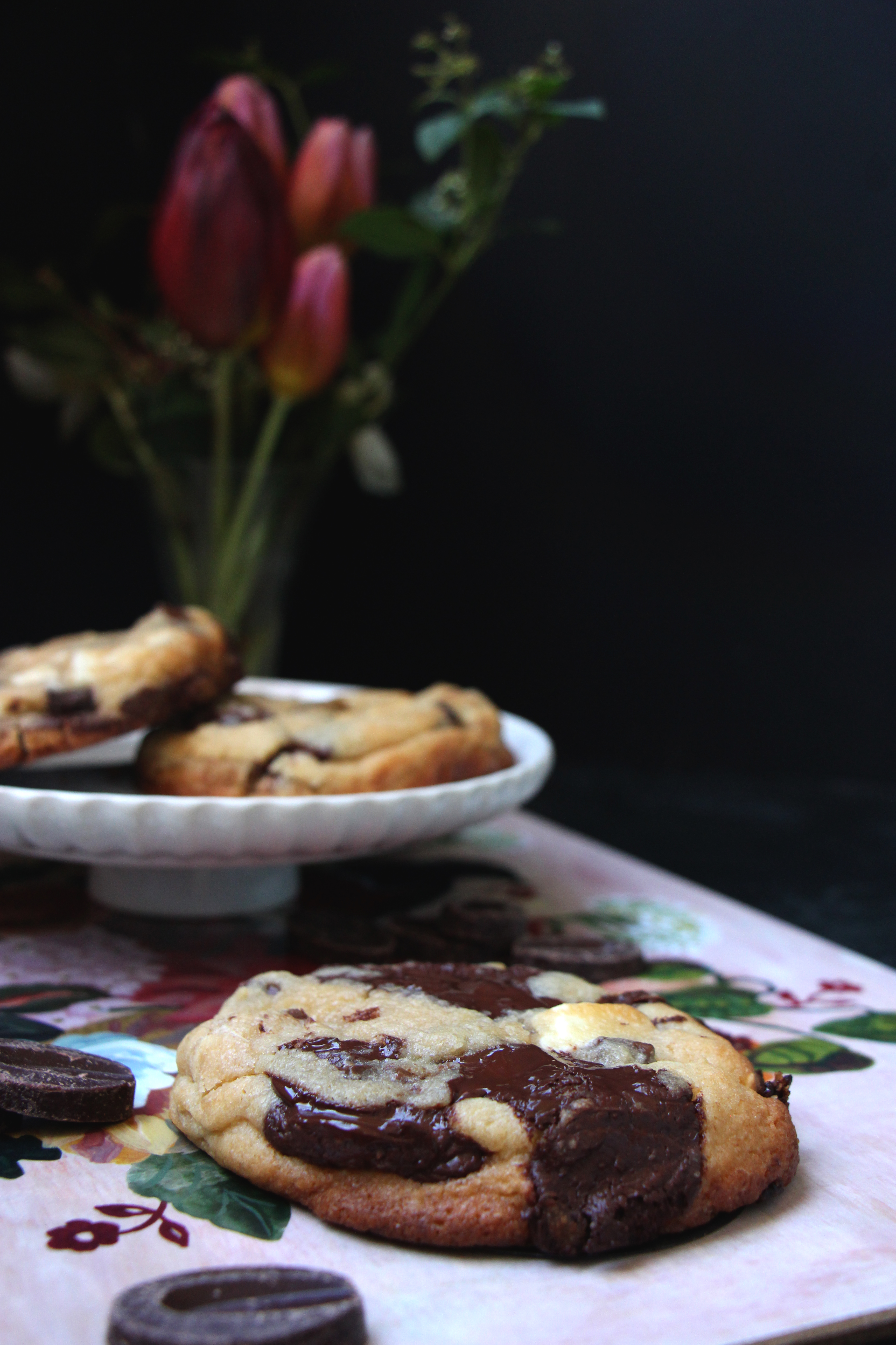 Quoi vous dire ? On a fait des cookies. On a découvert Puffy, une boutique qui fait des énnnnormmmes cookies trop bons. Addiction ! Bon, au début, il n’y avait pas trop de monde et les cookies basiques étaient à 3,50 euros. Maintenant, il n’est pas rare de faire la queue – la rançon du succès – et les prix ont augmenté de 30 centimes. Tout augmente, ma pauvre Lucette ! Bon, ça reste raisonnable, vu la taille des bestiaux et la tonne de chocolat dedans. En général, on en mange un pour deux. Alors oui, cette recette nous vient tout droit des États-Unis, le pays du zinzin. Sérieusement, on n’arrive toujours pas à comprendre comment les Américains ont ont pu réélire un taré pareil. Le bonhomme orange (pas Casimir, désolé pour lui) éructe sa prétendue supériorité, et le monde se plie en deux. Toujours se méfier des fous ! Le reste de la planète n’a qu’à bien se tenir face à cette folie et ramper pour lui lécher les bottes. Génuflexion… Ah, c’est pas assez ? Alors on se prosterne ! Heureusement, on a ces cookies XXL. Un peu de réconfort dans ce monde de fous, dans cet océan de dureté. Parce qu’au fond, même quand tout part en vrille, il reste des petites miettes d’amour, de générosité et de douceur. C’est beau, hein ? Alors, pâtissez, partagez, dévorez !