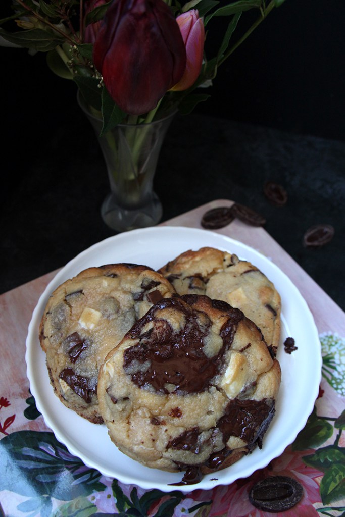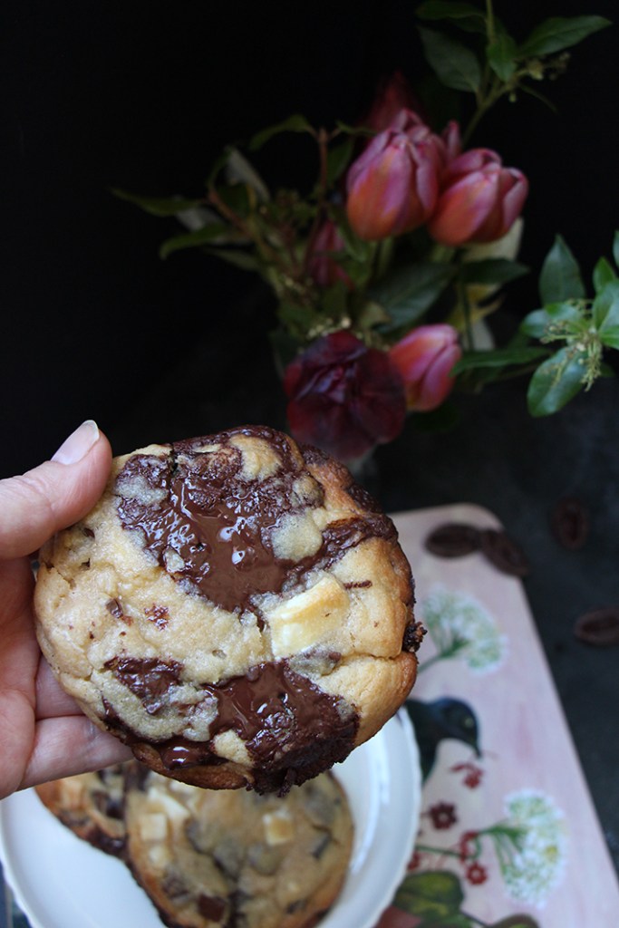 Enfournez pendant 12 -15 minutes (selon les fours) si vous faites des cookies de 170 g. Les bords doivent être légèrement dorés, mais le centre sera encore un peu sous-cuit. Les cookies vont durcir en refroidissant. Ne les manipulez pas tant qu’ils sont chauds pour ne pas les casser, sauf si vous ne pouvez pas résister. Dévorez !