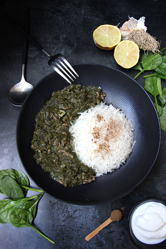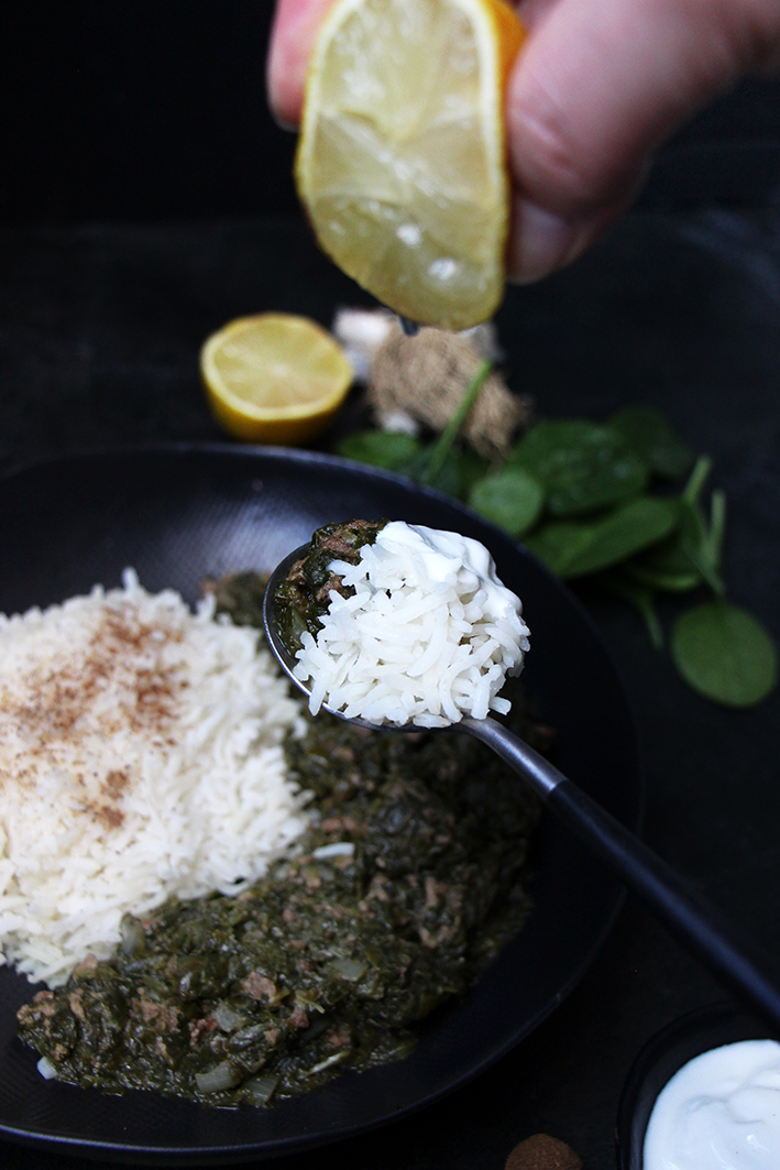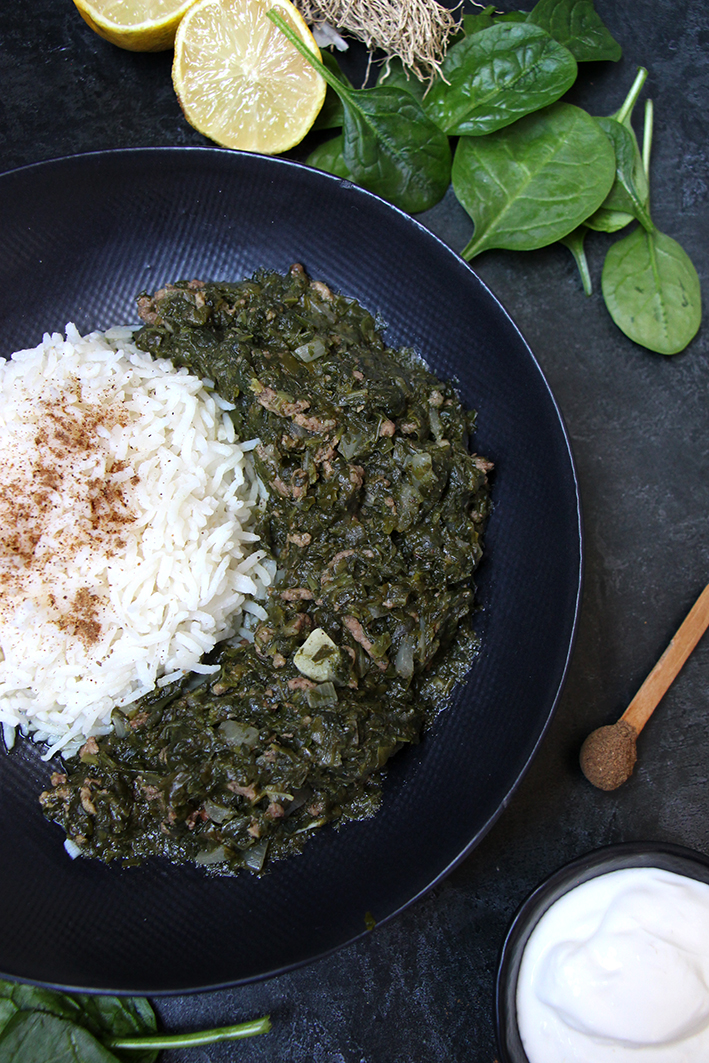 Lorsque la viande est cuite, ajoutez les épinards hachés et la moitié d’un verre d’eau. Laissez cuire 30 minutes, environ, à feu moyen en mélangeant de temps en temps. Dévorez avec du riz et accompagnez de yaourt nature et d’un filet de citron.