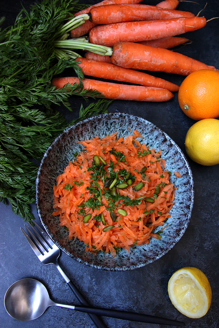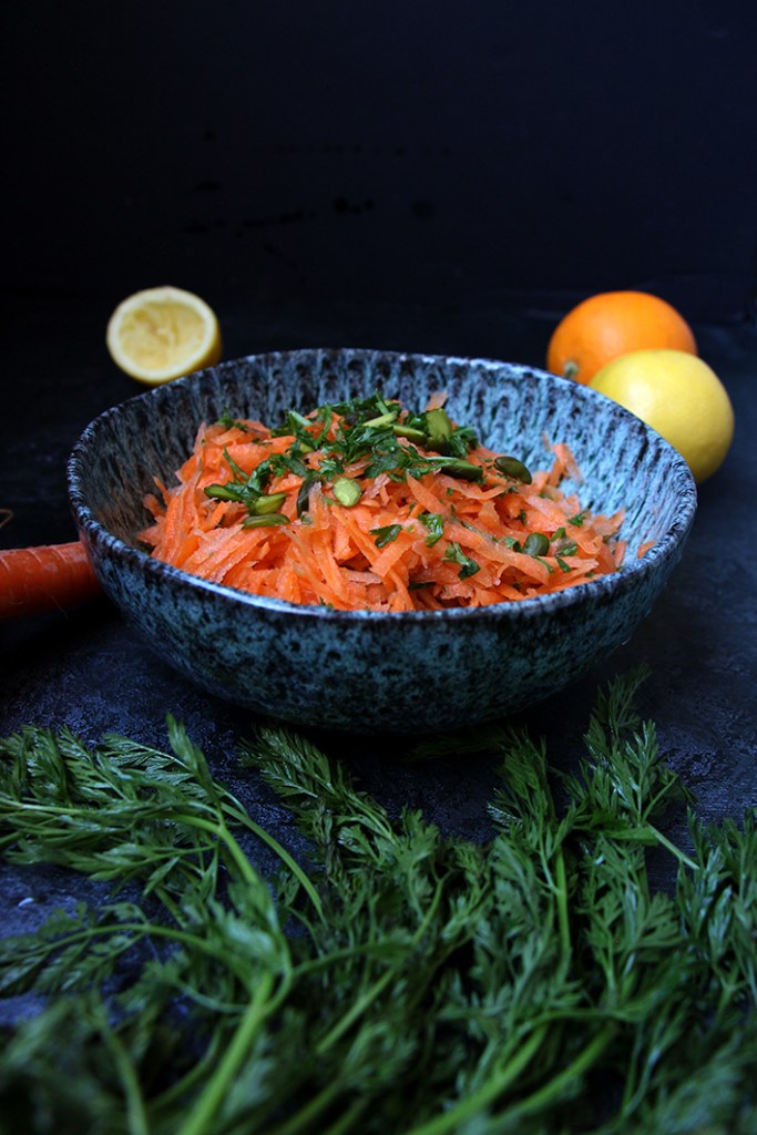Lavez les carottes, puis épluchez-les avant de les râper dans un saladier. Pressez les agrumes. Dans un bol, mélangez leurs jus avec l’huile d’olive et l’eau de fleur d’oranger. Versez la « vinaigrette » sur les carottes. Ajoutez les graines de coriandre et le persil ou la coriandre ciselée finement. Salez et poivrez à votre goût. Mélangez. Rectifiez l’assaisonnement si nécessaire. Décorez de pistaches. Dévorez !