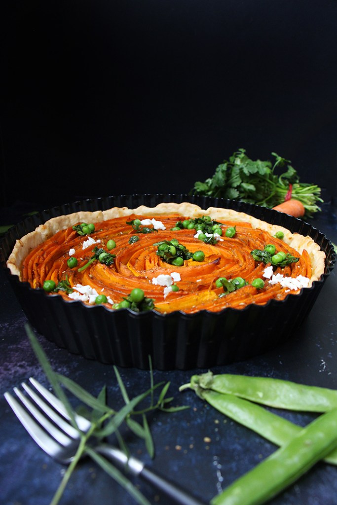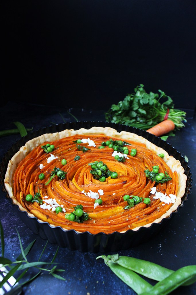 Étalez la pâte et placez-la dans votre plat à tarte. Étalez dessus, uniformément, une belle épaisseur du mélange de fromage. Disposez les tranches de carottes dessus, en rosace, en partant des bords. Réservez la marinade qui reste au fond du saladier. Enfournez pour 30-40 minutes.