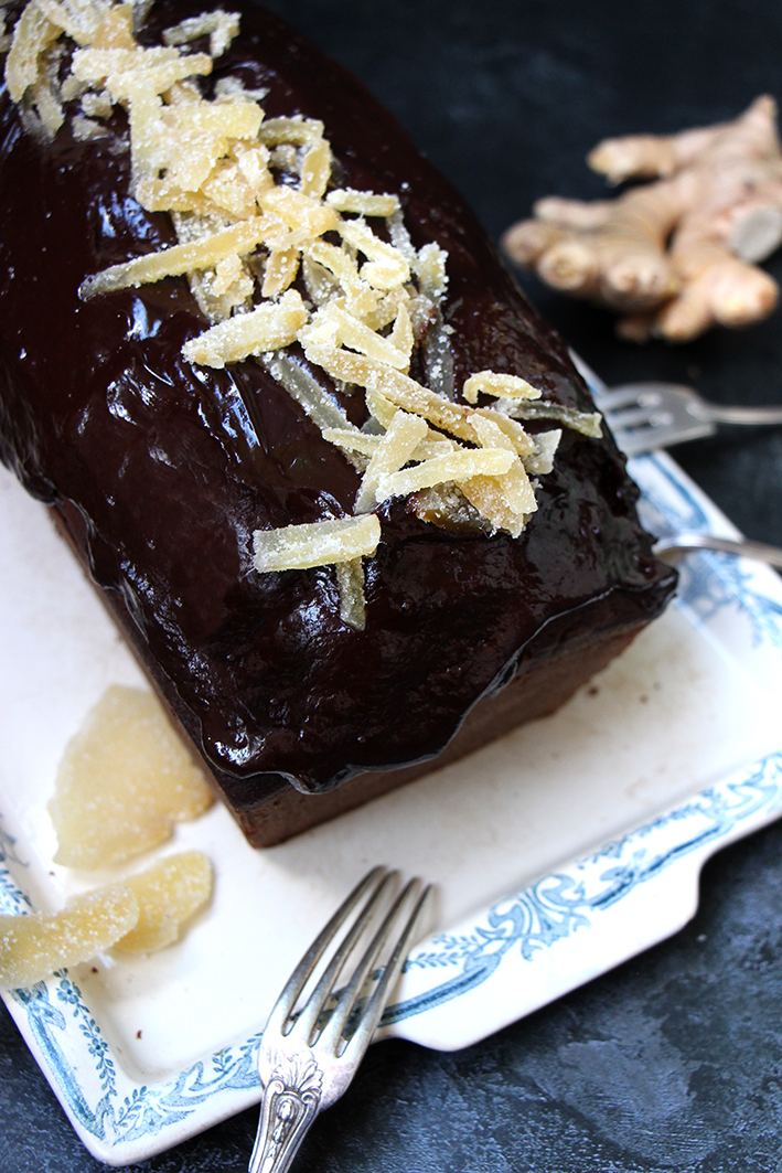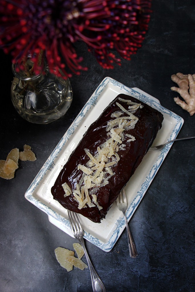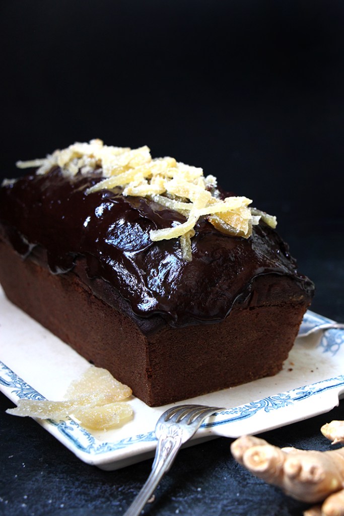 Posez le cake sur une grille, elle-même posée sur un plateau (propre). Versez le glaçage. Aidez-vous d’une spatule pour répartir le glaçage sur le dessus du cake pour faire une belle couche, bien épaisse. Décorez de pétales de gingembre confits émincés finement.