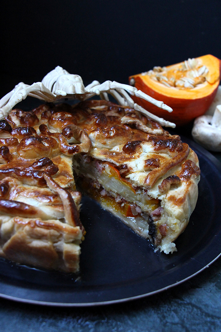 Placez la pâte dans un moule pas trop grand : elle doit bien remonter sur les bords. Étalez la moitié des pommes de terre, puis la moitié des tranches de potimarron, des champignons et du mélange oignons-lardons. Poivrez et couvrez de fromage. Recommencez avec le reste des ingrédients, en terminant par une couche de fromage.