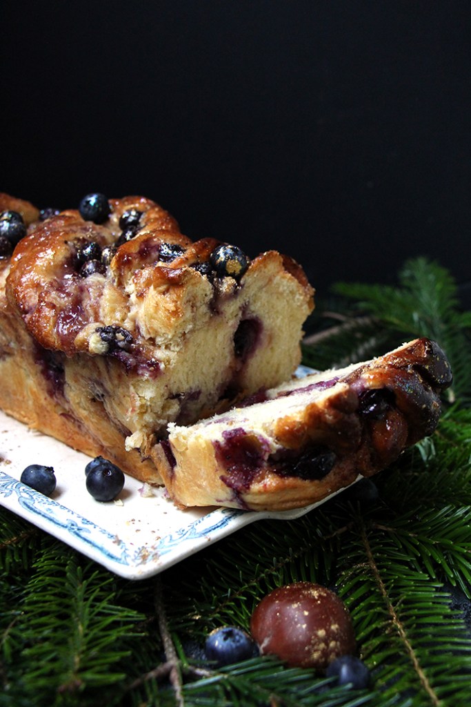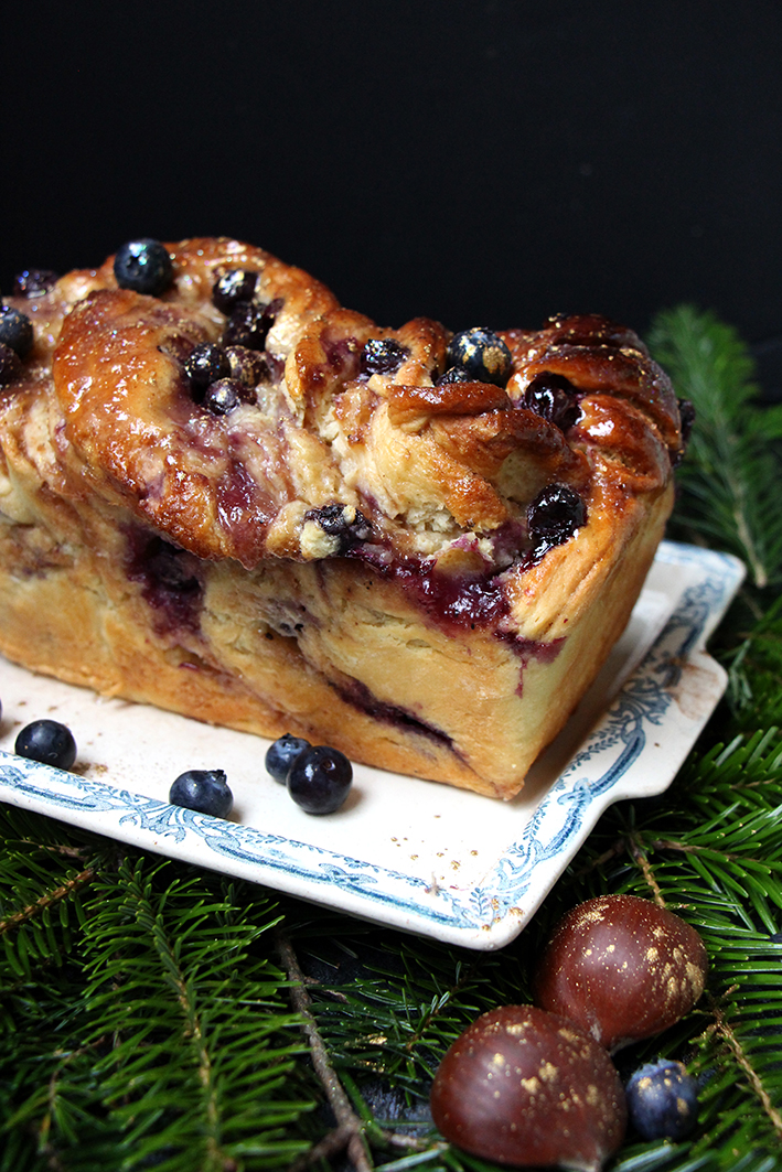 Farinez votre plan de travail. Étalez la pâte en un rectangle de 40 cm × 30 cm environ. Étalez la crème de marrons sur le rectangle de pâte, en laissant un centimètre sur un des grands bords. Saupoudrez d’un peu de 4 épices. Humidifiez, avec un peu d’eau, ce bord non tartiné. Cela permettra de souder le boudin obtenu. Répartissez les 350 g de myrtilles fraîches. Roulez la pâte dans la longueur, en commençant par le bord tartiné de crème, comme si vous faisiez un gâteau roulé. Vous obtenez un grand boudin. Coupez le boudin en deux dans le sens de la longueur, tout en laissant deux centimètres non coupés sur un des bouts, de façon à obtenir deux longues moitiés égales qui font apparaître les couches de garniture.