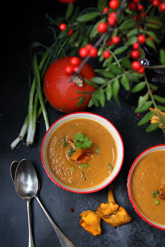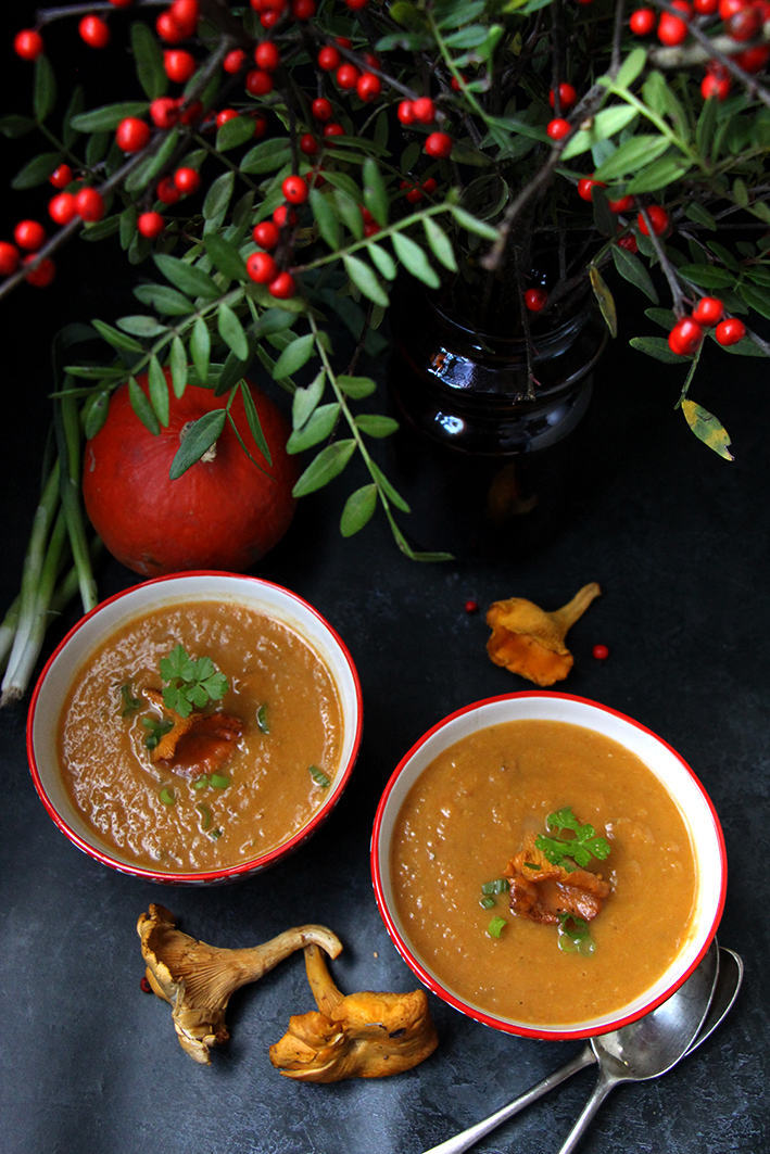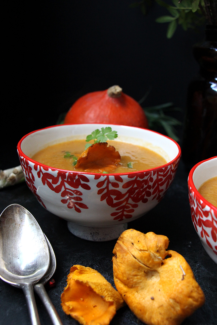 Servez dans de jolis bols et décorez avec les girolles restantes et quelques herbes fraîches (cerfeuil, persil ou autres). Dévorez 😋