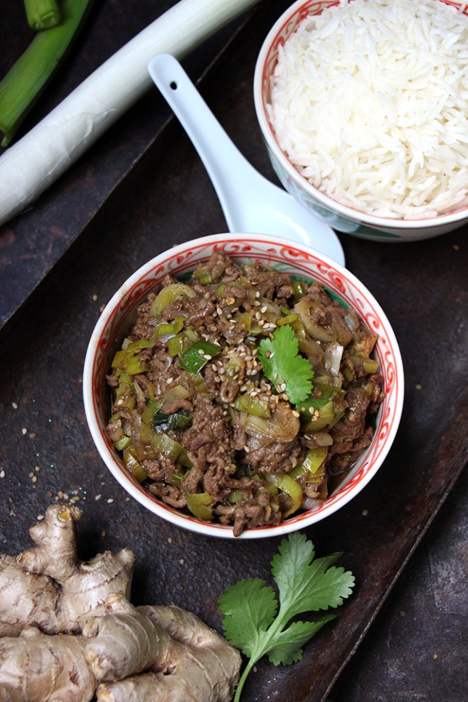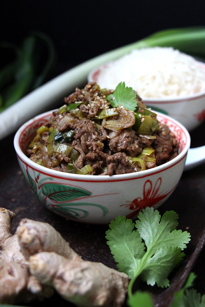 Dans un wok, faites revenir la viande avec un petit filet d’huile neutre, jusqu’à ce qu’elle ait une belle coloration (5 min). Ajoutez les poireaux émincés très finement, l’ail et le gingembre râpés. Faites revenir jusqu’à ce que les poireaux soient fondants. Ajoutez la sauce d’huître, les deux sauces soja, le vin chinois et l’huile de sésame. Mélangez, puis ajoutez l’eau pour détendre la sauce. Mélangez en grattant les sucs au fond du wok. Laissez réduire environ 5 minutes. Servez avec du riz, parsemé d’un peu de feuilles de coriandre et de graines de sésame. Dévorez !
