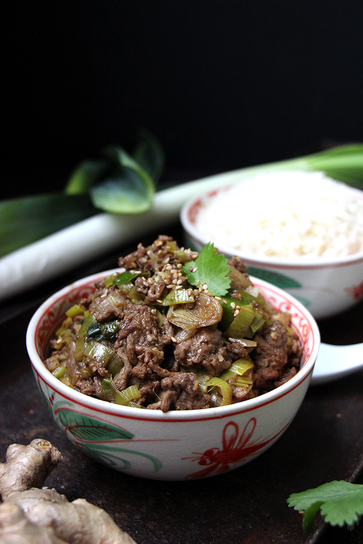 Dans un wok, faites revenir la viande avec un petit filet d’huile neutre, jusqu’à ce qu’elle ait une belle coloration (5 min). Ajoutez les poireaux émincés très finement, l’ail et le gingembre râpés. Faites revenir jusqu’à ce que les poireaux soient fondants. Ajoutez la sauce d’huître, les deux sauces soja, le vin chinois et l’huile de sésame. Mélangez, puis ajoutez l’eau pour détendre la sauce. Mélangez en grattant les sucs au fond du wok. Laissez réduire environ 5 minutes. Servez avec du riz, parsemé d’un peu de feuilles de coriandre et de graines de sésame. Dévorez !
