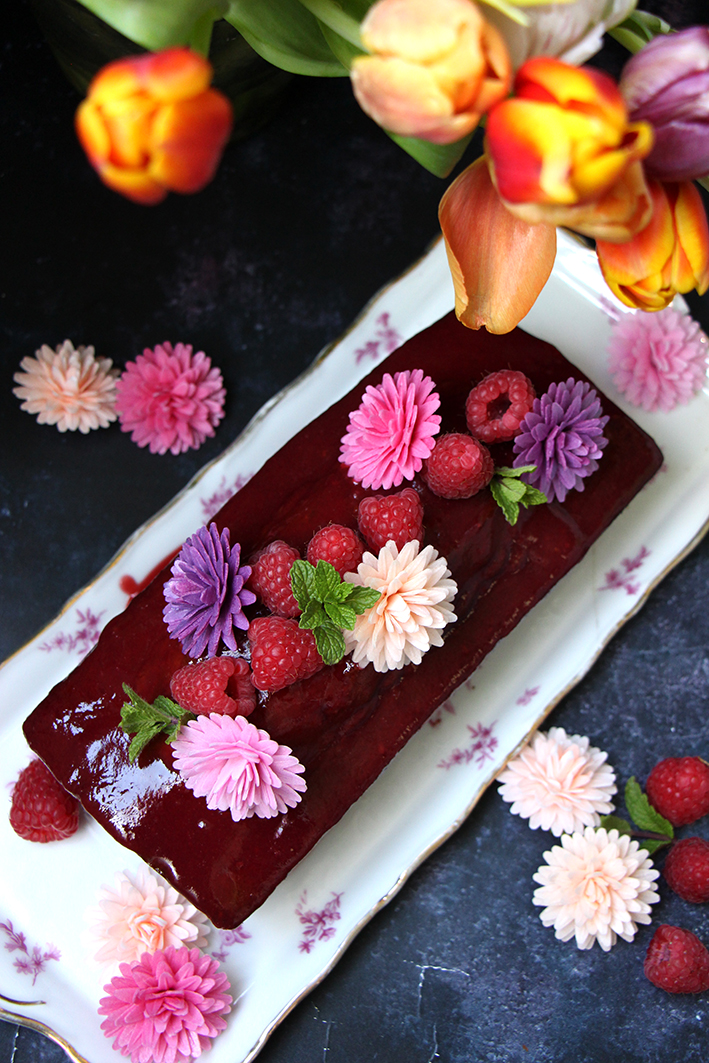 Décorez votre cake avec des fruits, feuilles de menthe ou fleurs (Ici, fleurs en papier azyme).