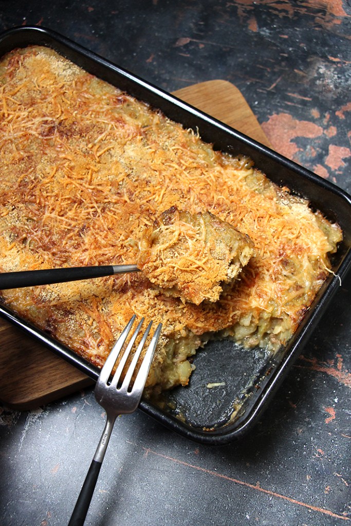 Mélangez la purée avec la viande et la moitié du gruyère. Autre option : alterner les couches, façon hachis Parmentier. Rectifiez l’assaisonnement.