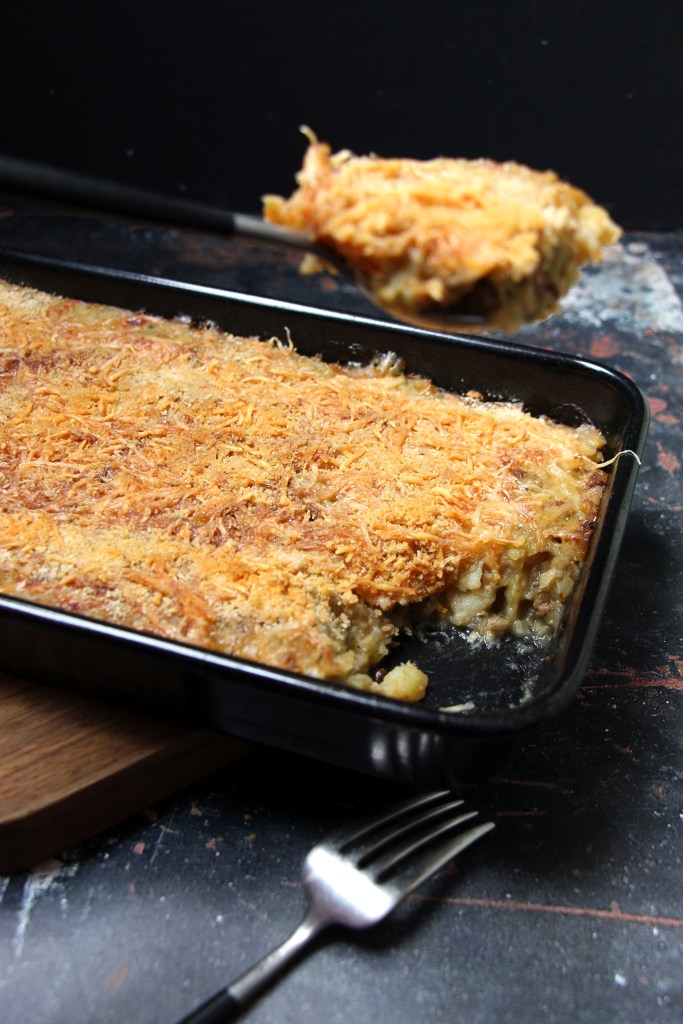 Versez dans un plat à gratin. Parsemez du reste de fromage, de chapelure et de petits morceaux de beurre. Enfournez à 180 °C pendant environ 25 minutes, jusqu’à ce que le dessus soit bien doré. Servez avec une salade. Dévorez !
