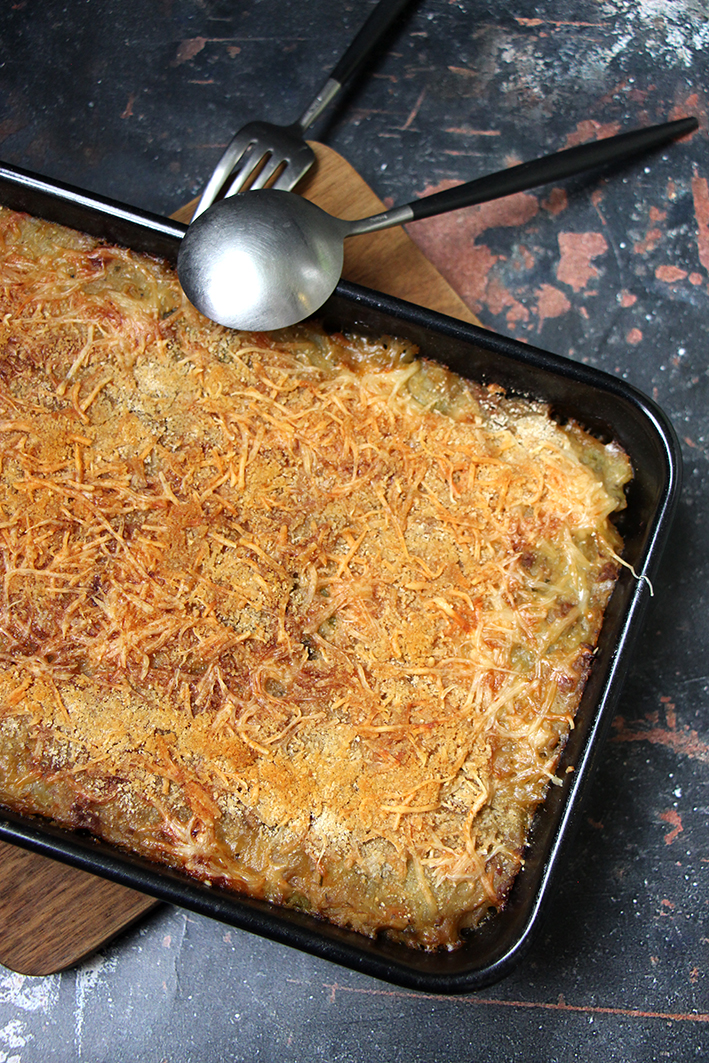 Versez dans un plat à gratin. Parsemez du reste de fromage, de chapelure et de petits morceaux de beurre. Enfournez à 180 °C pendant environ 25 minutes, jusqu’à ce que le dessus soit bien doré. Servez avec une salade. Dévorez !